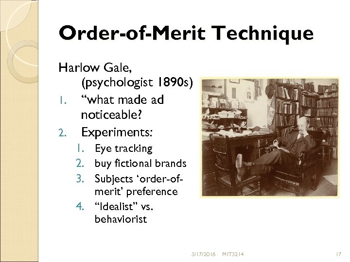 Order-of-Merit Technique Harlow Gale, (psychologist 1890 s) 1. “what made ad noticeable? 2. Experiments: 1. Eye tracking 2. buy fictional brands 3. Subjects ‘order-ofmerit’ preference 4. “Idealist” vs. behaviorist 3/17/2018 MIT 3214 17