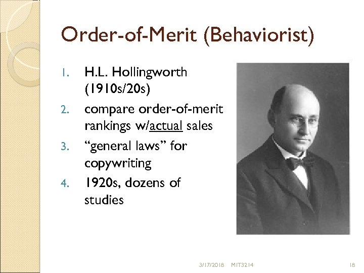 Order-of-Merit (Behaviorist) 1. 2. 3. 4. H. L. Hollingworth (1910 s/20 s) compare order-of-merit rankings w/actual sales “general laws” for copywriting 1920 s, dozens of studies 3/17/2018 MIT 3214 18