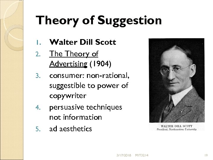 Theory of Suggestion 1. 2. 3. 4. 5. Walter Dill Scott Theory of Advertising (1904) consumer: non-rational, suggestible to power of copywriter persuasive techniques not information ad aesthetics 3/17/2018 MIT 3214 19