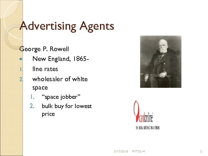 Advertising Agents George P. Rowell New England, 18651. line rates 2. wholesaler of white space 1. 2. “space jobber” bulk buy for lowest price 3/17/2018 MIT 3214 2