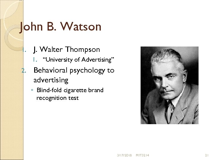 John B. Watson 1. J. Walter Thompson 1. “University of Advertising” 2. Behavioral psychology to advertising ◦ Blind-fold cigarette brand recognition test 3/17/2018 MIT 3214 21