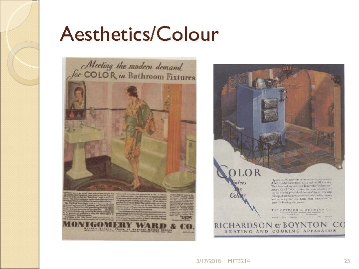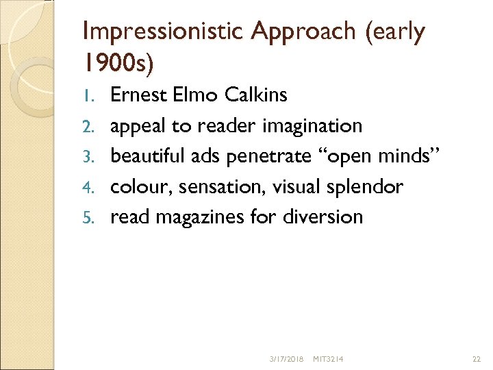 Impressionistic Approach (early 1900 s) 1. 2. 3. 4. 5. Ernest Elmo Calkins appeal to reader imagination beautiful ads penetrate “open minds” colour, sensation, visual splendor read magazines for diversion 3/17/2018 MIT 3214 22