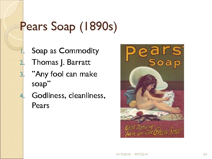 Pears Soap (1890 s) Soap as Commodity 2. Thomas J. Barratt 3. ”Any fool can make soap” 4. Godliness, cleanliness, Pears 1. 3/17/2018 MIT 3214 24