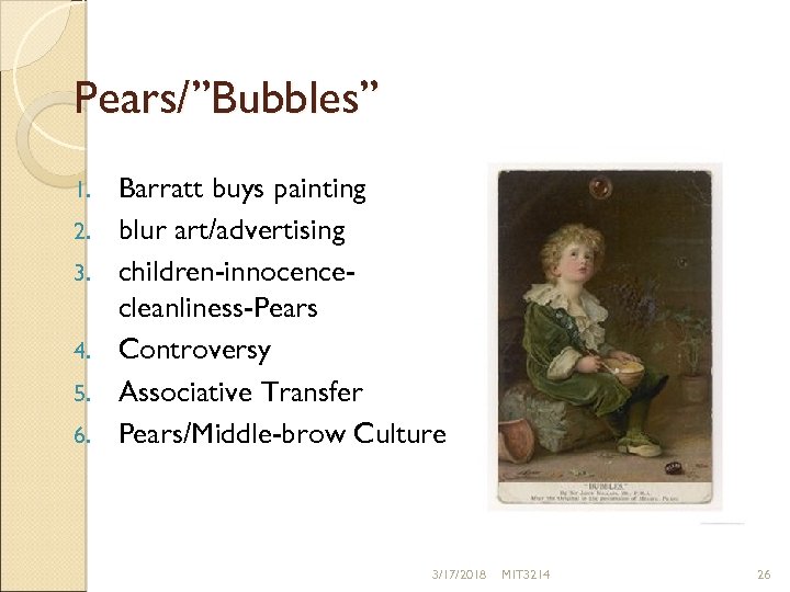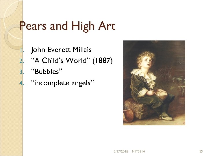 Pears and High Art John Everett Millais 2. “A Child’s World” (1887) 3. “Bubbles” 4. “incomplete angels” 1. 3/17/2018 MIT 3214 25