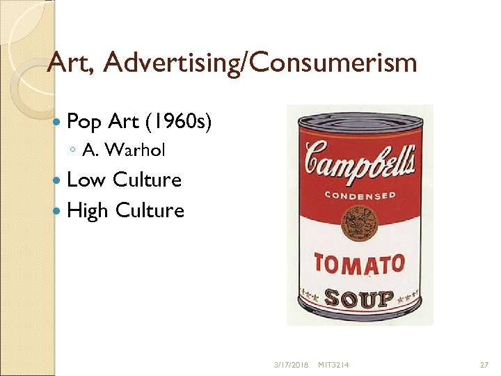 Art, Advertising/Consumerism Pop Art (1960 s) ◦ A. Warhol Low Culture High Culture 3/17/2018 MIT 3214 27