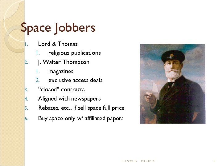 Space Jobbers 5. Lord & Thomas 1. religious publications J. Walter Thompson 1. magazines 2. exclusive access deals “closed” contracts Aligned with newspapers Rebates, etc. , if sell space full price 6. Buy space only w/ affiliated papers 1. 2. 3. 4. 3/17/2018 MIT 3214 3