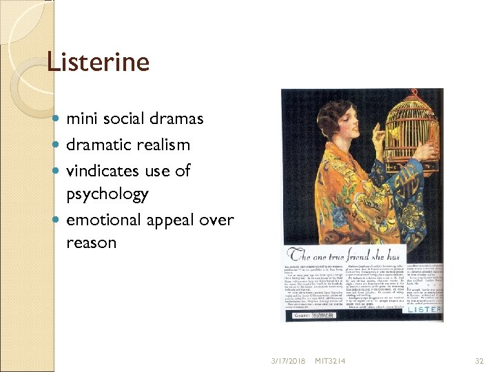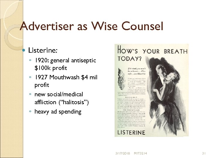 Advertiser as Wise Counsel Listerine: ◦ 1920: general antiseptic $100 k profit ◦ 1927 Mouthwash $4 mil profit ◦ new social/medical affliction (“halitosis”) ◦ heavy ad spending 3/17/2018 MIT 3214 31