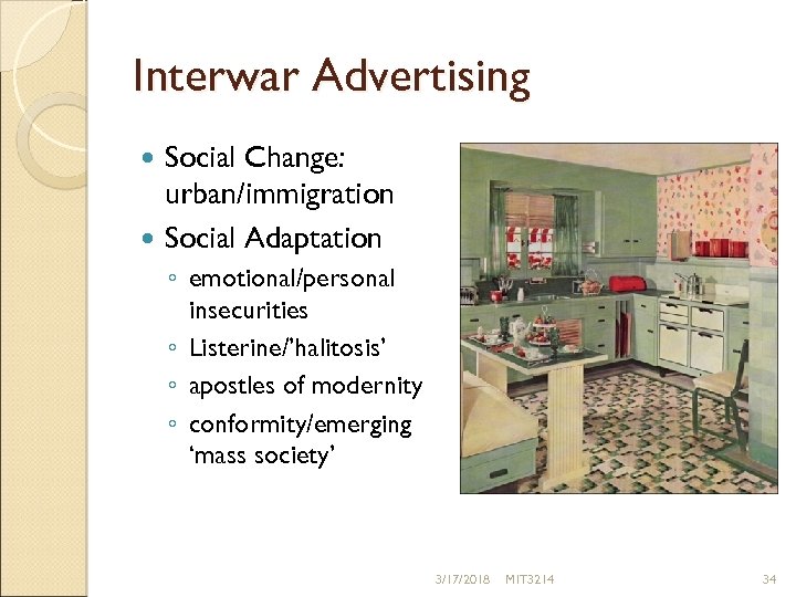 Interwar Advertising Social Change: urban/immigration Social Adaptation ◦ emotional/personal insecurities ◦ Listerine/’halitosis’ ◦ apostles of modernity ◦ conformity/emerging ‘mass society’ 3/17/2018 MIT 3214 34