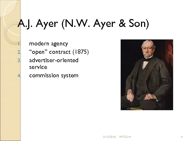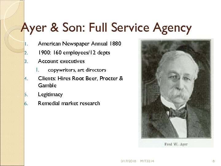 A. J. Ayer (N. W. Ayer & Son) 1. 2. 3. 4. modern agency “open” contract (1875) advertiser-oriented service commission system 3/17/2018 MIT 3214 4