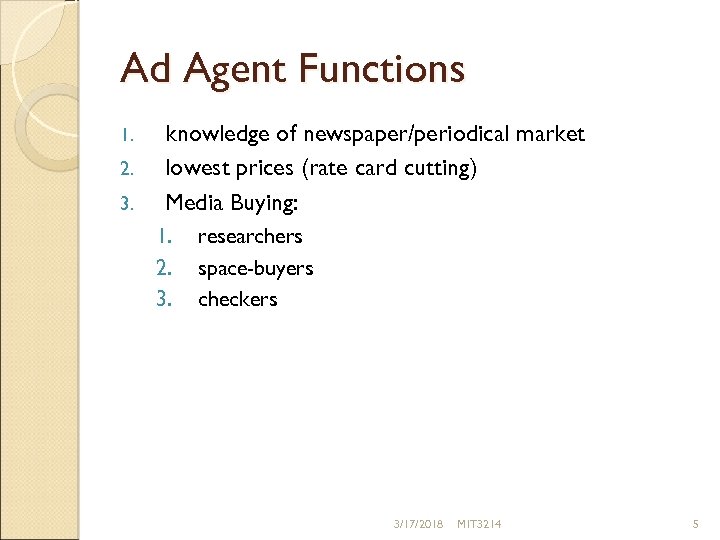 Ad Agent Functions 1. 2. 3. knowledge of newspaper/periodical market lowest prices (rate card cutting) Media Buying: 1. 2. 3. researchers space-buyers checkers 3/17/2018 MIT 3214 5