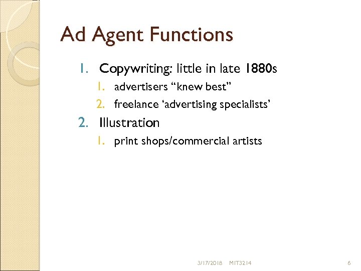 Ad Agent Functions 1. Copywriting: little in late 1880 s 1. advertisers “knew best” 2. freelance ‘advertising specialists’ 2. Illustration 1. print shops/commercial artists 3/17/2018 MIT 3214 6