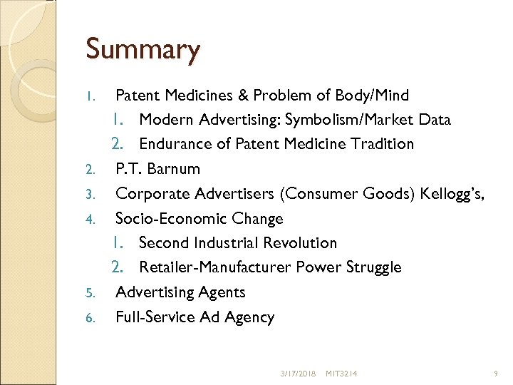 Summary 1. 2. 3. 4. 5. 6. Patent Medicines & Problem of Body/Mind 1. Modern Advertising: Symbolism/Market Data 2. Endurance of Patent Medicine Tradition P. T. Barnum Corporate Advertisers (Consumer Goods) Kellogg’s, Socio-Economic Change 1. Second Industrial Revolution 2. Retailer-Manufacturer Power Struggle Advertising Agents Full-Service Ad Agency 3/17/2018 MIT 3214 9