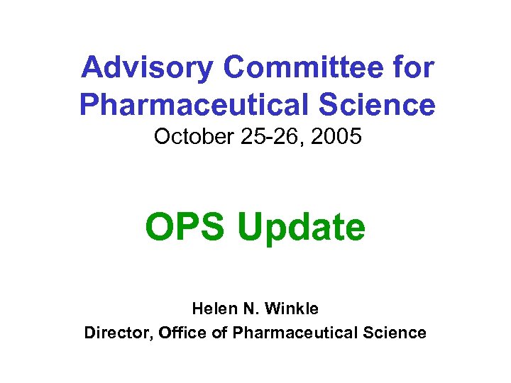 Advisory Committee for Pharmaceutical Science October 25 -26, 2005 OPS Update Helen N. Winkle Director, Office of Pharmaceutical Science