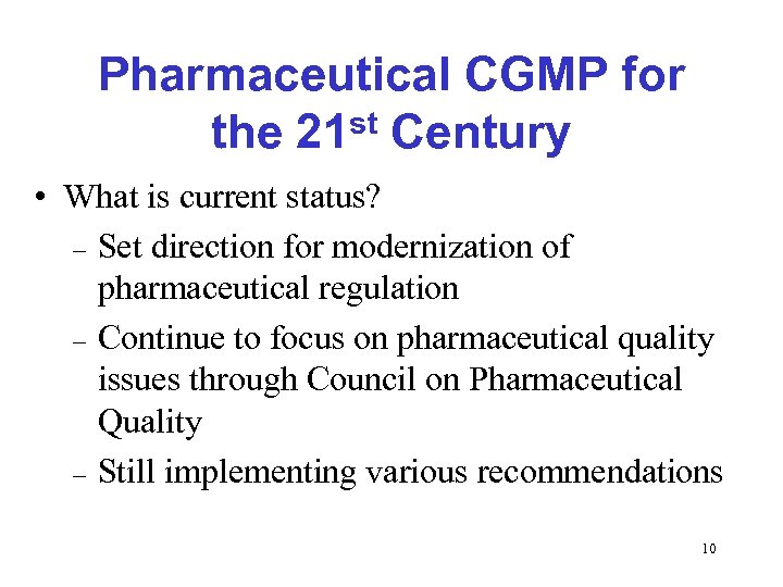 Pharmaceutical CGMP for the 21 st Century • What is current status? – Set direction for modernization of pharmaceutical regulation – Continue to focus on pharmaceutical quality issues through Council on Pharmaceutical Quality – Still implementing various recommendations 10
