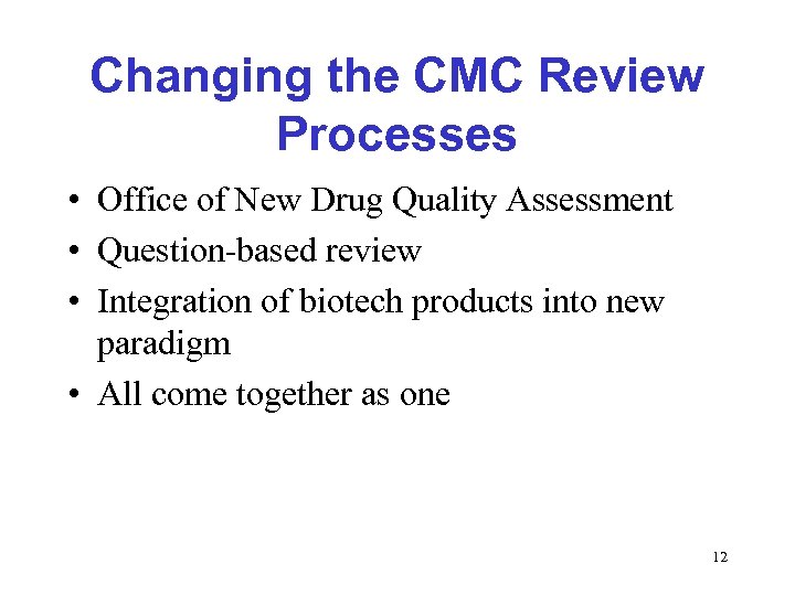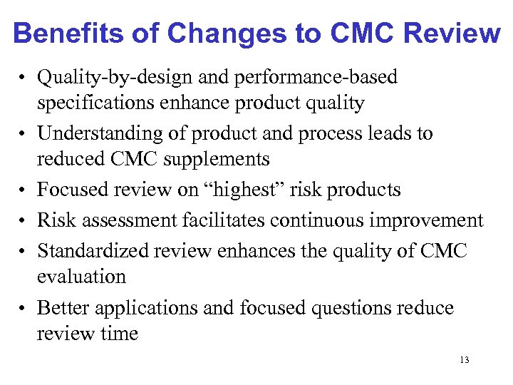 Changing the CMC Review Processes • Office of New Drug Quality Assessment • Question-based review • Integration of biotech products into new paradigm • All come together as one 12