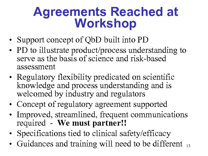 CMC Workshop • • Held October 5, 6, and 7 Over 600 in attendance Focused on new paradigm for CMC review Discussed quality-by-design (Qb. D), design space, pharmaceutical development data (PD), continuous improvement (CI) and quality overall summary (QOS) • Set stage for moving forward with the new processes 14