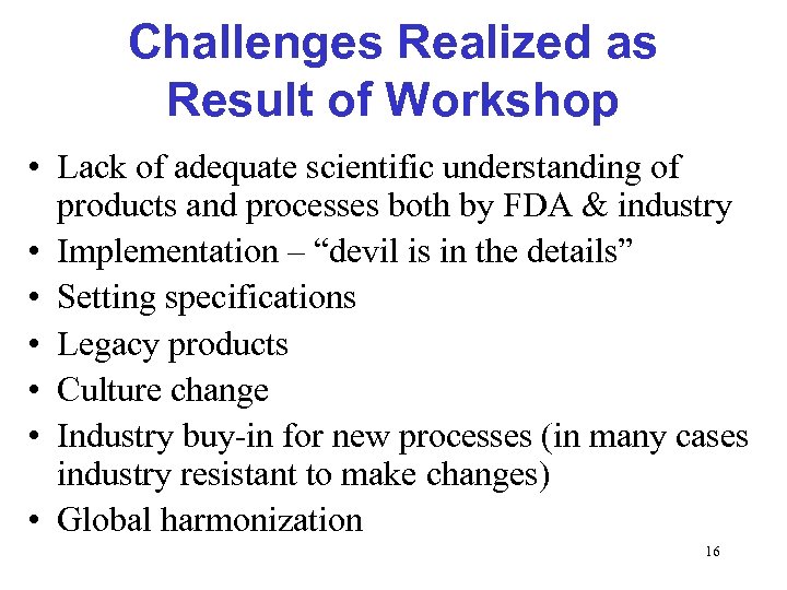 Agreements Reached at Workshop • Support concept of Qb. D built into PD • PD to illustrate product/process understanding to serve as the basis of science and risk-based assessment • Regulatory flexibility predicated on scientific knowledge and process understanding and is welcomed by industry and regulators • Concept of regulatory agreement supported • Improved, streamlined, frequent communications required - We must partner!! • Specifications tied to clinical safety/efficacy • Guidances and training will need to be different 15