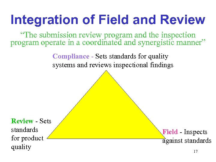 Integration of Field and Review “The submission review program and the inspection program operate in a coordinated and synergistic manner” Compliance - Sets standards for quality systems and reviews inspectional findings Review - Sets standards for product quality Field - Inspects against standards 17