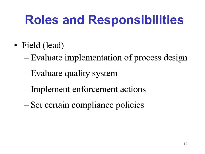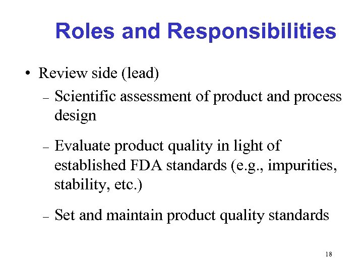 Roles and Responsibilities • Review side (lead) – Scientific assessment of product and process design – Evaluate product quality in light of established FDA standards (e. g. , impurities, stability, etc. ) – Set and maintain product quality standards 18