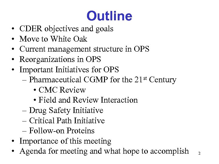 Outline • • • CDER objectives and goals Move to White Oak Current management structure in OPS Reorganizations in OPS Important Initiatives for OPS – Pharmaceutical CGMP for the 21 st Century • CMC Review • Field and Review Interaction – Drug Safety Initiative – Critical Path Initiative – Follow-on Proteins • Importance of this meeting • Agenda for meeting and what hope to accomplish 2