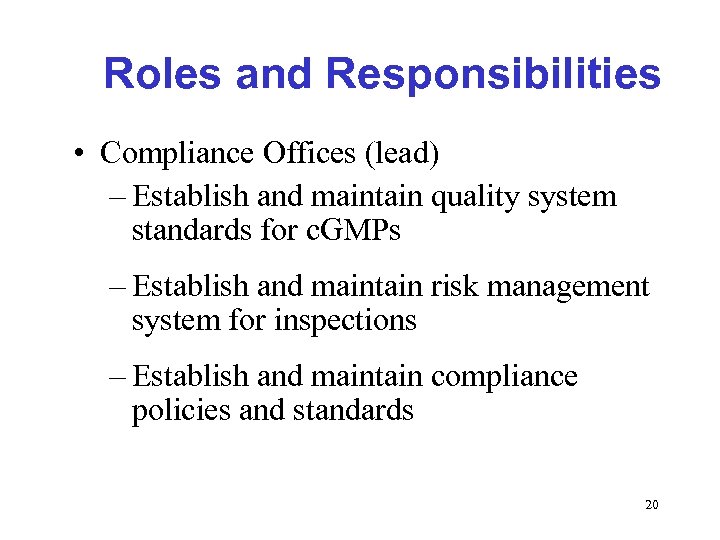 Roles and Responsibilities • Compliance Offices (lead) – Establish and maintain quality system standards for c. GMPs – Establish and maintain risk management system for inspections – Establish and maintain compliance policies and standards 20