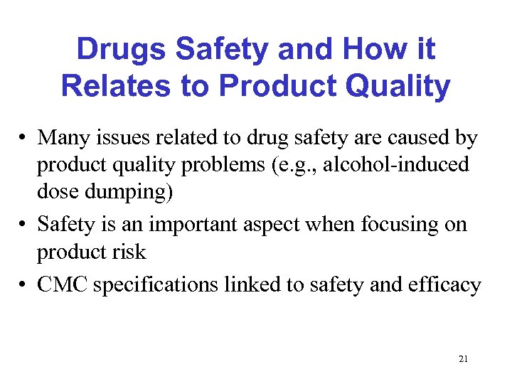 Drugs Safety and How it Relates to Product Quality • Many issues related to drug safety are caused by product quality problems (e. g. , alcohol-induced dose dumping) • Safety is an important aspect when focusing on product risk • CMC specifications linked to safety and efficacy 21