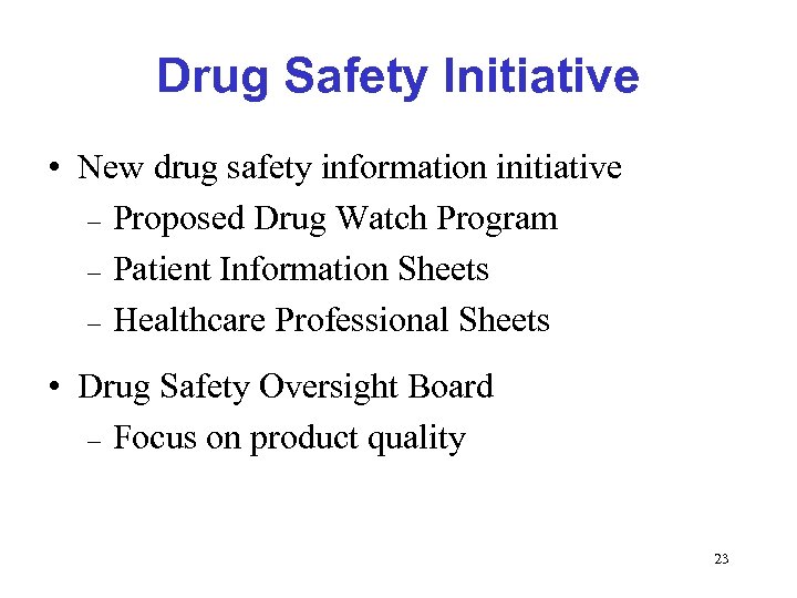 Drug Safety – How Focused in Center • Drugs safer than they have ever been • FDA as organization learns well from experience with large number of products • What we’ve heard: – More info – address gap between FDA and others – Improve internal processes to manage safety issues – Involve outside experts more • Secretary Leavitt recently announced a new drug safety initiative – Promote a culture of openness and 22 – Enhanced oversight within the FDA