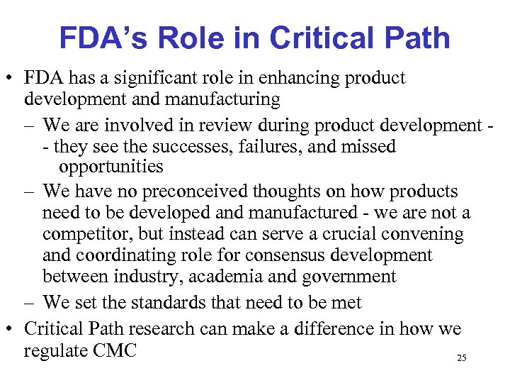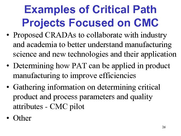 FDA’s Role in Critical Path • FDA has a significant role in enhancing product development and manufacturing – We are involved in review during product development - they see the successes, failures, and missed opportunities – We have no preconceived thoughts on how products need to be developed and manufactured - we are not a competitor, but instead can serve a crucial convening and coordinating role for consensus development between industry, academia and government – We set the standards that need to be met • Critical Path research can make a difference in how we regulate CMC 25