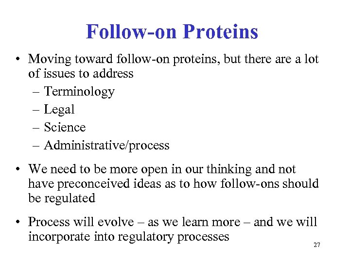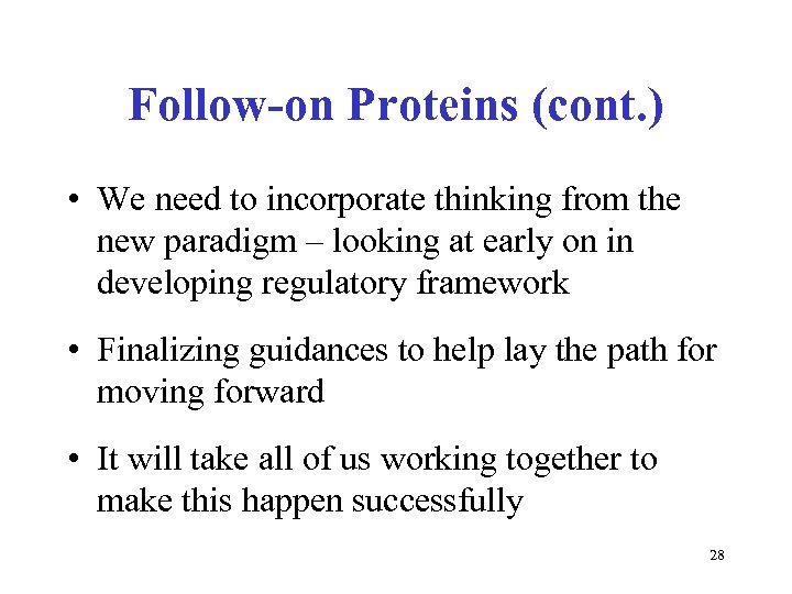 Follow-on Proteins • Moving toward follow-on proteins, but there a lot of issues to address – Terminology – Legal – Science – Administrative/process • We need to be more open in our thinking and not have preconceived ideas as to how follow-ons should be regulated • Process will evolve – as we learn more – and we will incorporate into regulatory processes 27