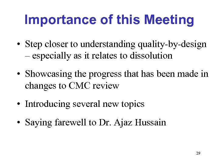 Importance of this Meeting • Step closer to understanding quality-by-design – especially as it relates to dissolution • Showcasing the progress that has been made in changes to CMC review • Introducing several new topics • Saying farewell to Dr. Ajaz Hussain 29
