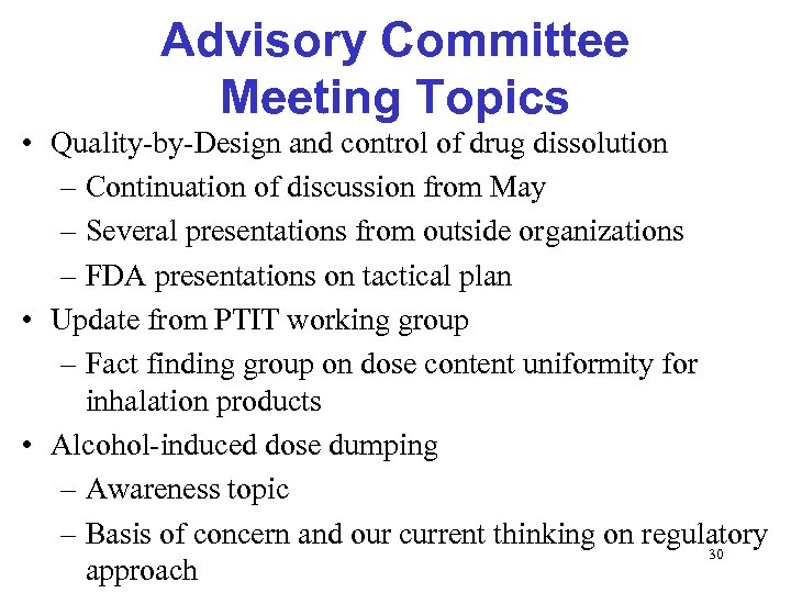 Advisory Committee Meeting Topics • Quality-by-Design and control of drug dissolution – Continuation of discussion from May – Several presentations from outside organizations – FDA presentations on tactical plan • Update from PTIT working group – Fact finding group on dose content uniformity for inhalation products • Alcohol-induced dose dumping – Awareness topic – Basis of concern and our current thinking on regulatory 30 approach