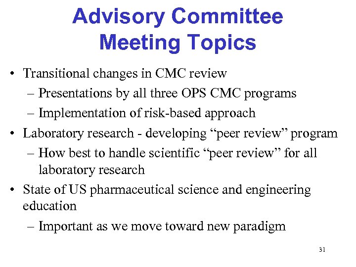 Advisory Committee Meeting Topics • Transitional changes in CMC review – Presentations by all three OPS CMC programs – Implementation of risk-based approach • Laboratory research - developing “peer review” program – How best to handle scientific “peer review” for all laboratory research • State of US pharmaceutical science and engineering education – Important as we move toward new paradigm 31