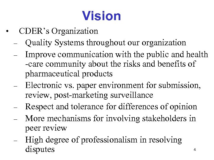 CDER State of the Center – Dr. Galson’s Vision for CDER’s Future • CDER’s leadership – International scientific leader in drug development and innovative regulatory science – Many active, robust, productive scientific partnerships with outside groups – Regulatory programs are consistent, efficient and transparent 3