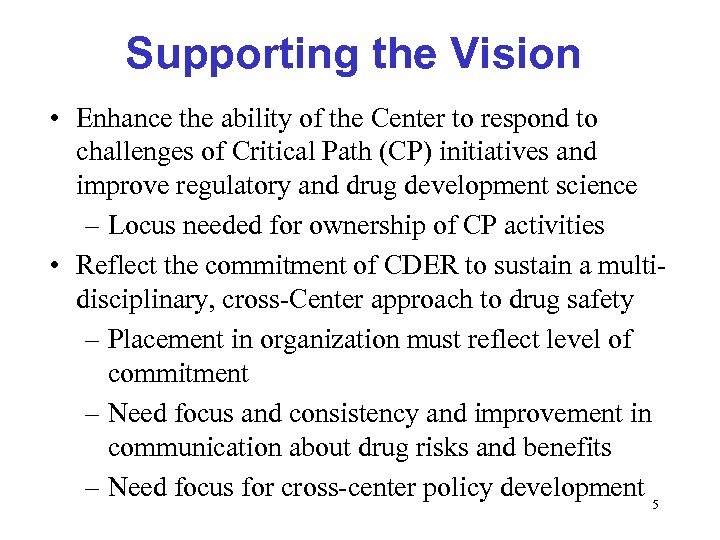 Vision • CDER’s Organization – Quality Systems throughout our organization – Improve communication with the public and health -care community about the risks and benefits of pharmaceutical products – Electronic vs. paper environment for submission, review, post-marketing surveillance – Respect and tolerance for differences of opinion – More mechanisms for involving stakeholders in peer review – High degree of professionalism in resolving 4 disputes