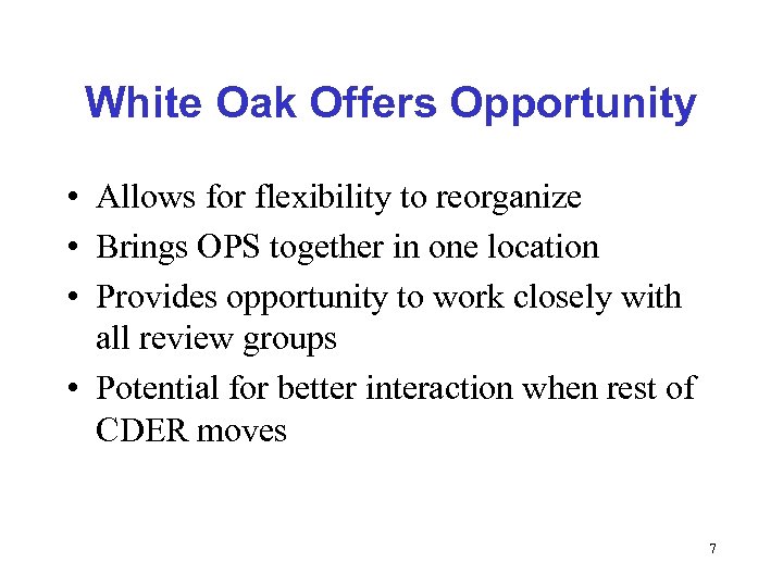 White Oak Offers Opportunity • Allows for flexibility to reorganize • Brings OPS together in one location • Provides opportunity to work closely with all review groups • Potential for better interaction when rest of CDER moves 7
