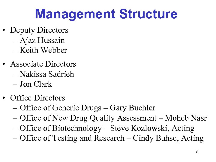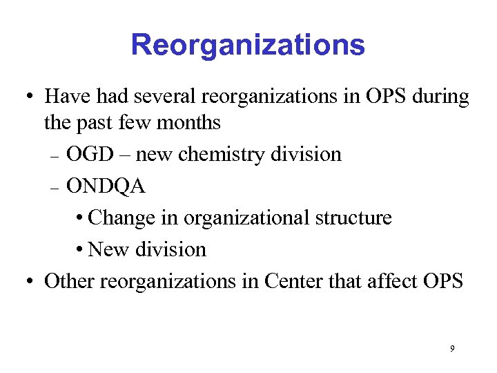 Management Structure • Deputy Directors – Ajaz Hussain – Keith Webber • Associate Directors – Nakissa Sadrieh – Jon Clark • Office Directors – Office of Generic Drugs – Gary Buehler – Office of New Drug Quality Assessment – Moheb Nasr – Office of Biotechnology – Steve Kozlowski, Acting – Office of Testing and Research – Cindy Buhse, Acting 8