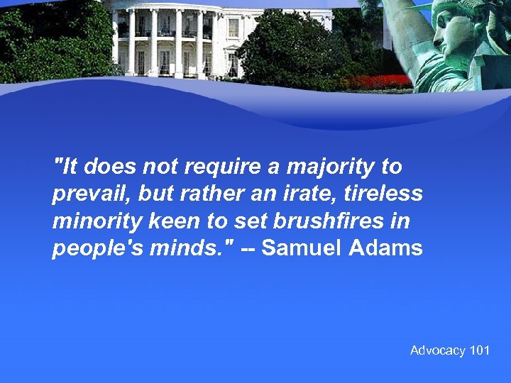 "It does not require a majority to prevail, but rather an irate, tireless minority keen to set brushfires in people's minds. " -- Samuel Adams Advocacy 101