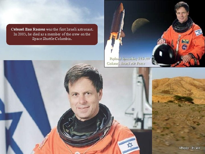 Colonel Ilan Ramon was the first Israeli astronaut. In 2003, he died as a member of the crew on the Space Shuttle Columbia.