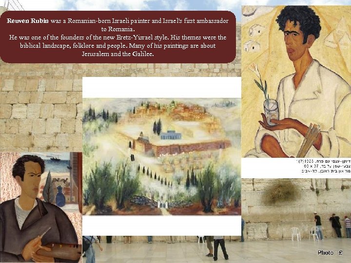 Reuven Rubin was a Romanian-born Israeli painter and Israel's first ambassador to Romania. He was one of the founders of the new Eretz-Yisrael style. His themes were the biblical landscape, folklore and people. Many of his paintings are about Jerusalem and the Galilee.