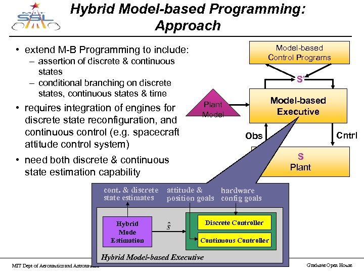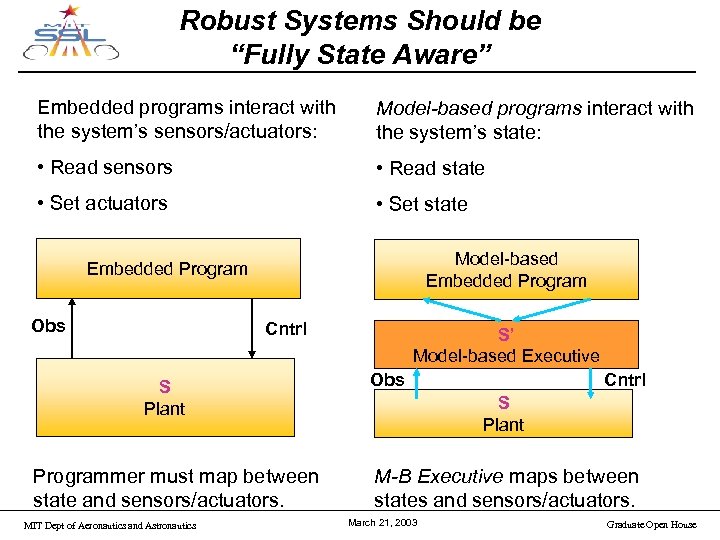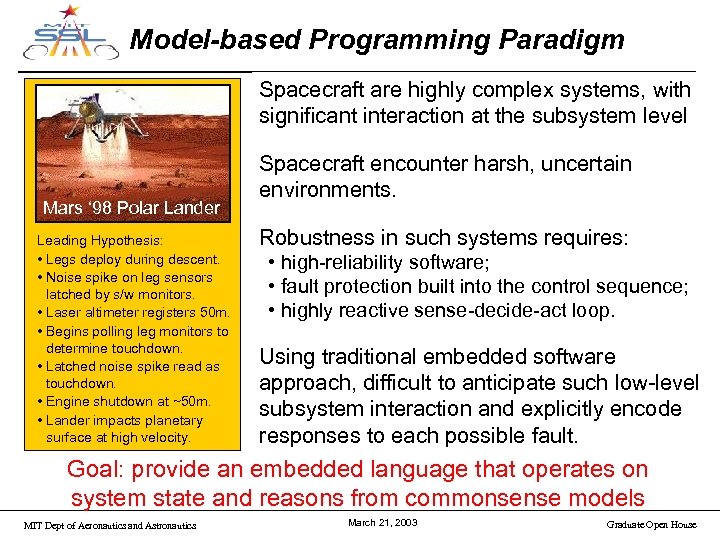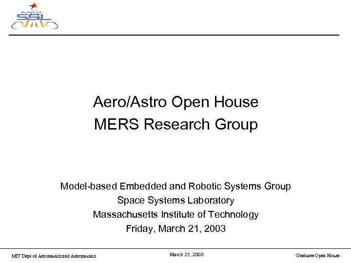 Aero/Astro Open House MERS Research Group Model-based Embedded and Robotic Systems Group Space Systems Laboratory Massachusetts Institute of Technology Friday, March 21, 2003 MIT Dept of Aeronautics and Astronautics March 21, 2003 Graduate Open House