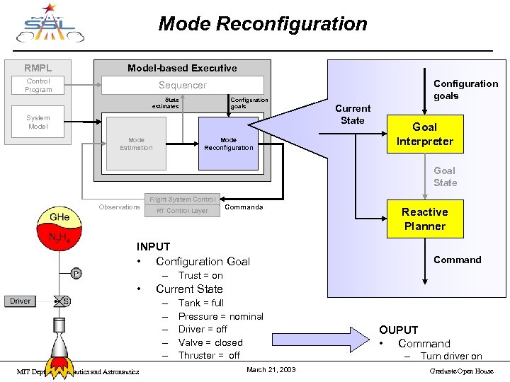 Mode Reconfiguration RMPL Model-based Executive Control Program Sequencer State estimates Configuration goals System Model Mode Estimation Mode Reconfiguration Configuration goals Current State Goal Interpreter Goal State Flight System Control Observations RT Control Layer Commands INPUT • Configuration Goal Reactive Planner Command – Trust = on • Current State – – – MIT Dept of Aeronautics and Astronautics Tank = full Pressure = nominal Driver = off Valve = closed Thruster = off March 21, 2003 OUPUT • Command – Turn driver on Graduate Open House