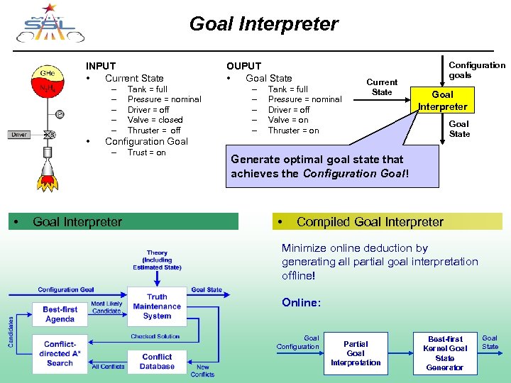 Goal Interpreter INPUT • Current State – – – • – – – Tank = full Pressure = nominal Driver = off Valve = on Thruster = on Current State Configuration goals Goal Interpreter Goal State Configuration Goal – • Tank = full Pressure = nominal Driver = off Valve = closed Thruster = off OUPUT • Goal State Trust = on Goal Interpreter Generate optimal goal state that achieves the Configuration Goal! • Compiled Goal Interpreter Minimize online deduction by generating all partial goal interpretation offline! Online: Goal Configuration MIT Dept of Aeronautics and Astronautics March 21, 2003 Partial Goal Interpretation Best-first Kernel Goal State Generator Goal State Graduate Open House