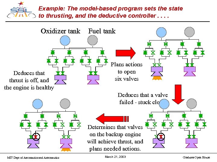 Example: The model-based program sets the state to thrusting, and the deductive controller. . Oxidizer tank Deduces that thrust is off, and the engine is healthy Fuel tank Plans actions to open six valves Deduces that a valve failed - stuck closed Determines that valves on the backup engine will achieve thrust, and plans needed actions. MIT Dept of Aeronautics and Astronautics March 21, 2003 Graduate Open House