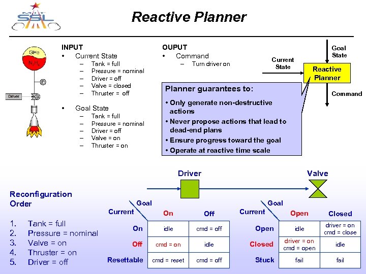 Reactive Planner INPUT • Current State – – – • OUPUT • Command Tank = full Pressure = nominal Driver = off Valve = closed Thruster = off Goal State – – – Tank = full Pressure = nominal Driver = off Valve = on Thruster = on – Goal State Current State Turn driver on Reactive Planner guarantees to: Command • Only generate non-destructive actions • Never propose actions that lead to dead-end plans • Ensure progress toward the goal • Operate at reactive time scale Driver Reconfiguration Order Valve Goal Current 1. Tank = full On 2. Pressure = nominal 3. Valve = on Off 4. Thruster = on 5. Dept of Aeronautics and Astronautics Resettable Driver = off MIT Goal On Off idle cmd = off cmd = on idle cmd = reset cmd = off March 21, 2003 Current Open Closed Stuck Open Closed idle driver = on cmd = close driver = on cmd = open idle fail Graduate Open House