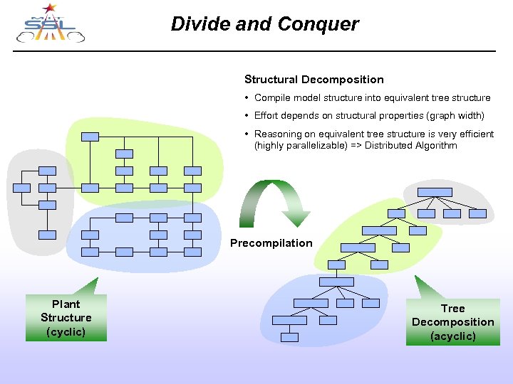 Divide and Conquer Structural Decomposition • Compile model structure into equivalent tree structure • Effort depends on structural properties (graph width) • Reasoning on equivalent tree structure is very efficient (highly parallelizable) => Distributed Algorithm Precompilation Plant Structure (cyclic) MIT Dept of Aeronautics and Astronautics Tree Decomposition (acyclic) March 21, 2003 Graduate Open House
