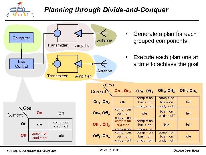Planning through Divide-and-Conquer Computer • Generate a plan for each grouped components. Antenna Transmitter Amplifier • Execute each plan one at a time to achieve the goal Bus Control Antenna Transmitter Amplifier Goal Current On. T, On. A On. T, Off. A Off. T, On. A idle comp = on bus = on cmd. A = off fail idle bus = on cmd. T = off fail idle fail comp = on bus = on cmd. A = off idle On. T, On. A Goal On Off On. T, Off. A On idle comp = on cmd = off Off. T, Off. A Off comp = on cmd = on idle Off. T, On. A Current MIT Dept of Aeronautics and Astronautics comp = on bus = on cmd. A = on comp = on bus = on cmd. T = on comp = on bus = on cmd. A = off March 21, 2003 comp = on bus = on cmd. T = on comp = on bus = on cmd. A = off Graduate Open House