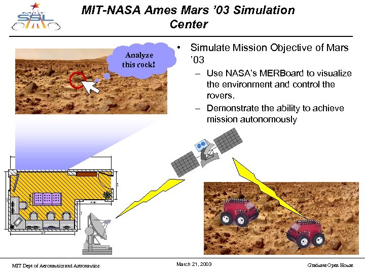 MIT-NASA Ames Mars ’ 03 Simulation Center Analyze this rock! MIT Dept of Aeronautics and Astronautics • Simulate Mission Objective of Mars ’ 03 – Use NASA’s MERBoard to visualize the environment and control the rovers. – Demonstrate the ability to achieve mission autonomously March 21, 2003 Graduate Open House