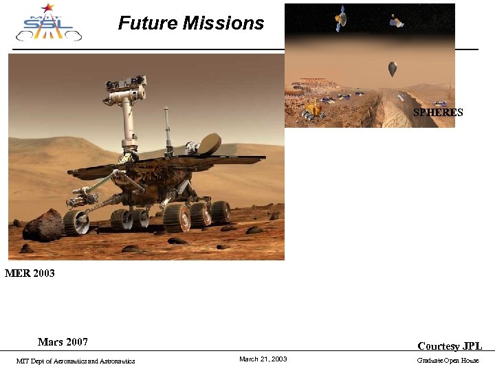 Future Missions SPHERES MER 2003 Mars 2007 MIT Dept of Aeronautics and Astronautics Courtesy JPL March 21, 2003 Graduate Open House