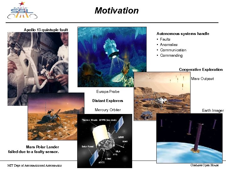 Motivation Apollo 13 quintuple fault Autonomous systems handle • Faults • Anomalies • Communication • Commanding Cooperative Exploration Mars Outpost Europa Probe Distant Explorers Mercury Orbiter Earth Imager Mars Polar Lander failed due to a faulty sensor. MIT Dept of Aeronautics and Astronautics March 21, 2003 Graduate Open House
