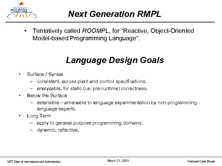 Next Generation RMPL • Tentatively called ROOMPL, for “Reactive, Object-Oriented Model-based Programming Language”. Language Design Goals • • • Surface / Syntax – consistent, across plant and control specifications. – analyzable, for static (i. e. pre-runtime) correctness. Below the Surface – extensible – amenable to language experimentation by non-programming language experts. Long Term – apply to general purpose programming domains. – dynamic, reflective. MIT Dept of Aeronautics and Astronautics March 21, 2003 Graduate Open House